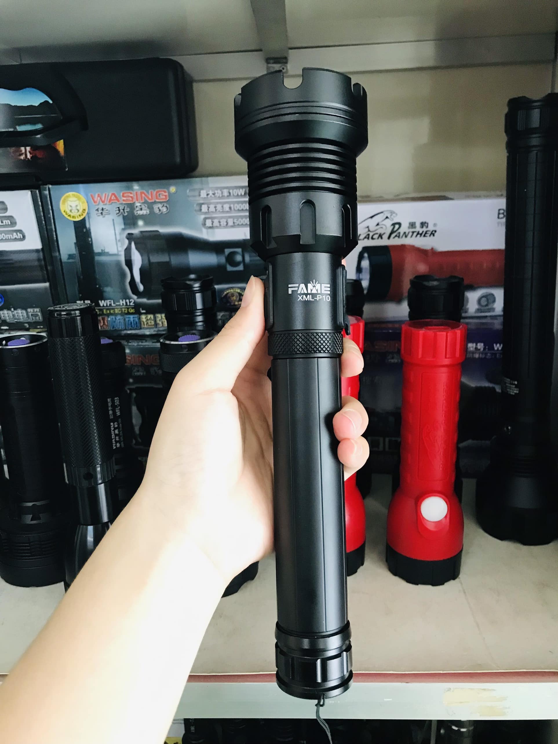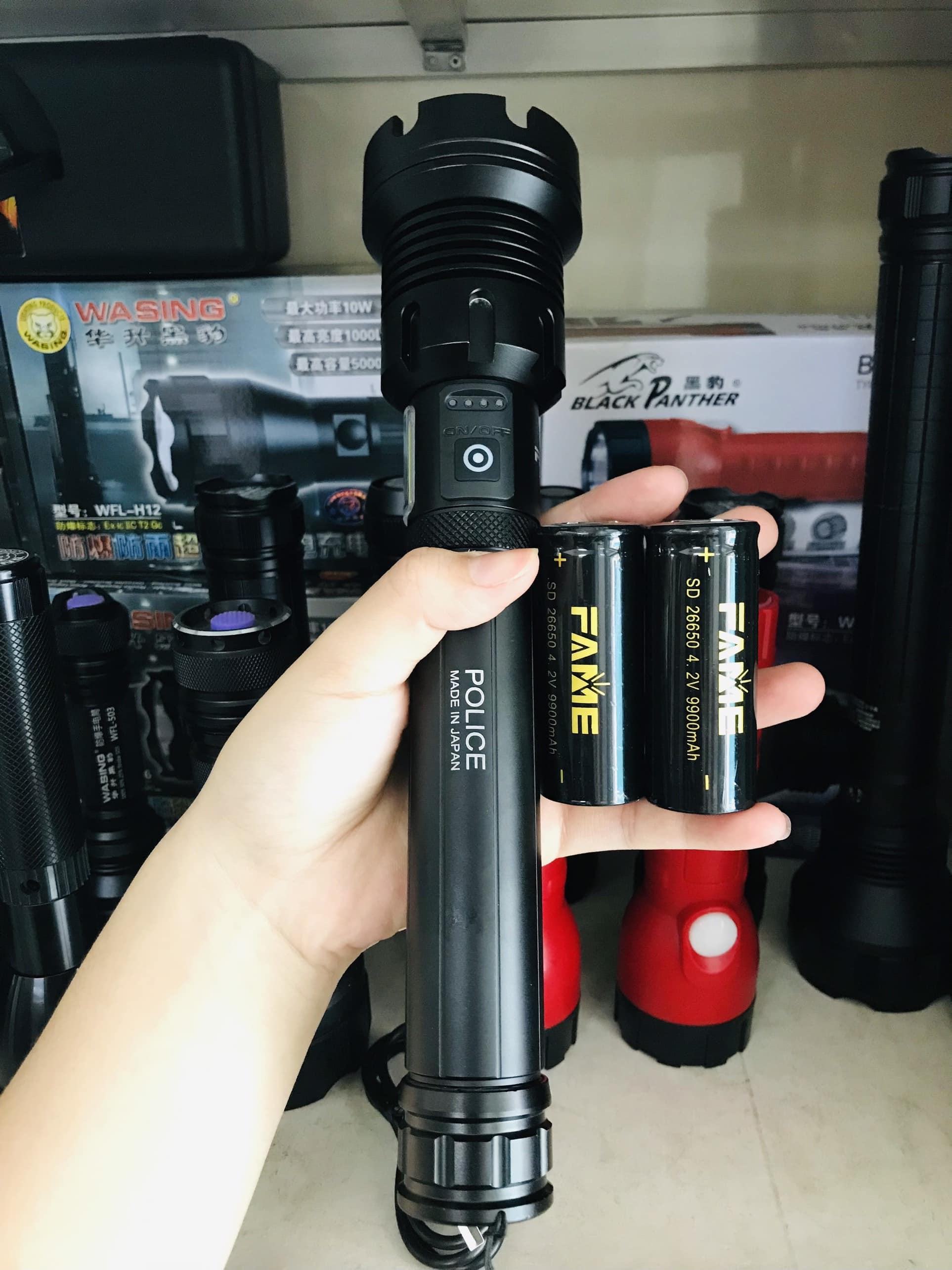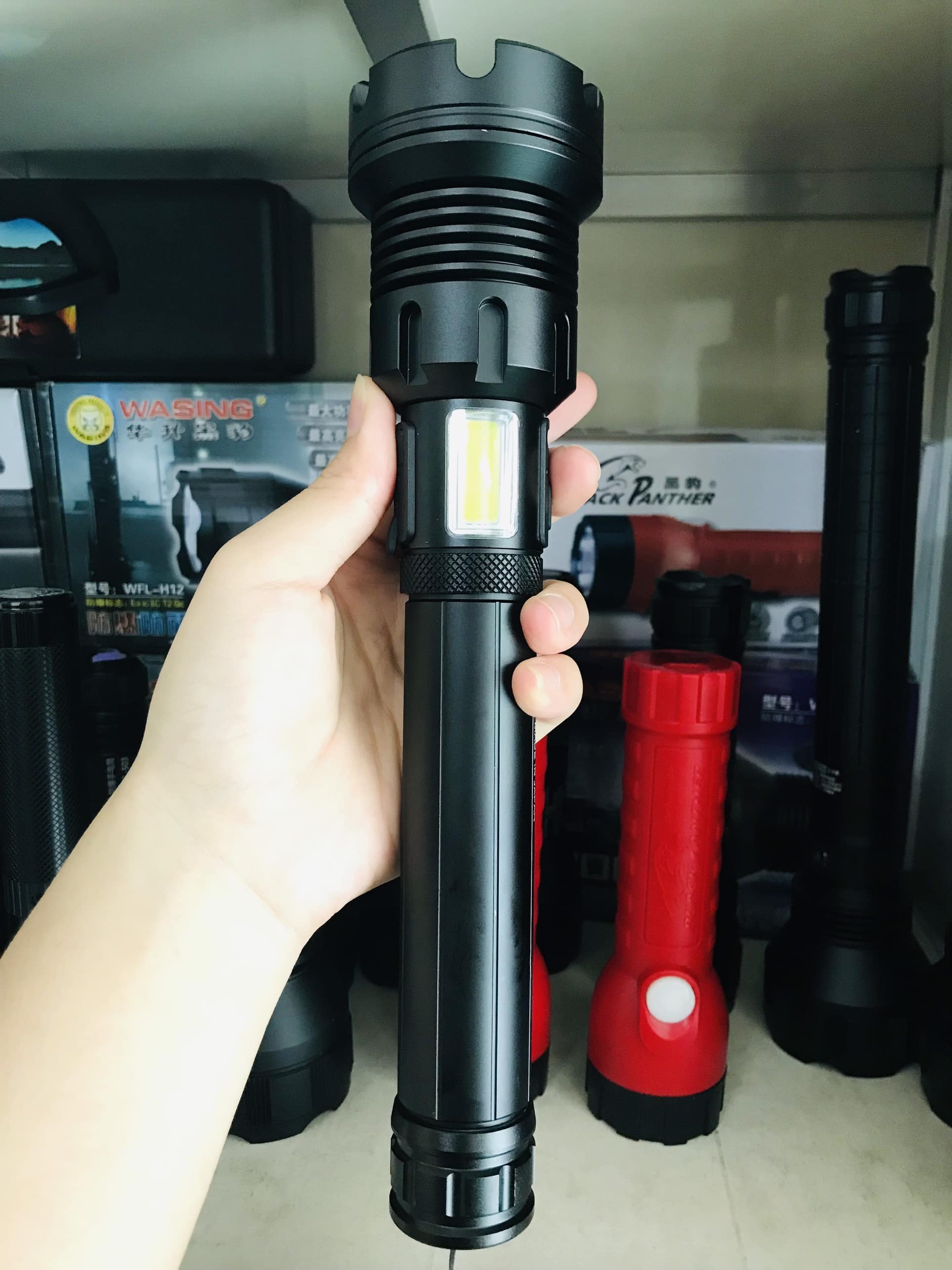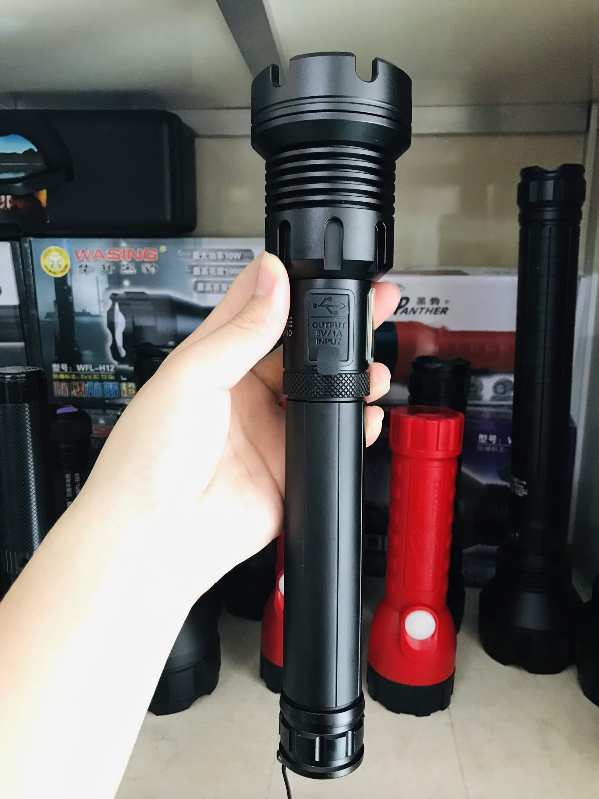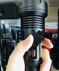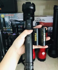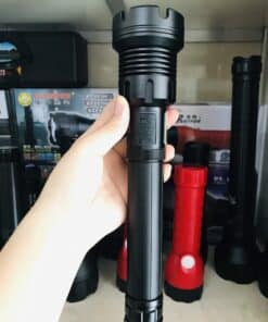 Đèn pin siêu sáng HONGJUN X9000. Với chiều dài thân đèn hơn 26cm và trọng lượng đèn là 0.4kg. Thiết kế này rất phù hợp để trang bị cho các đội bảo vệ hoặc người canh gác đồn điền, trang trại